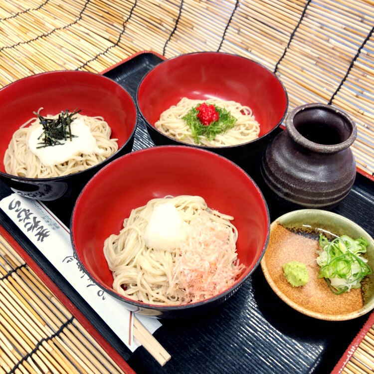 とろろ、大根おろし、梅しその三種類のおそばを